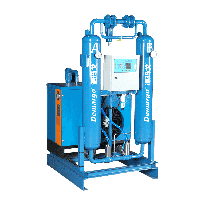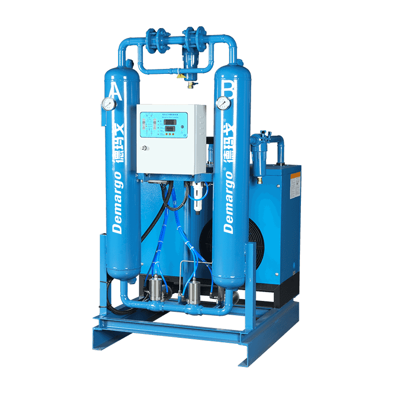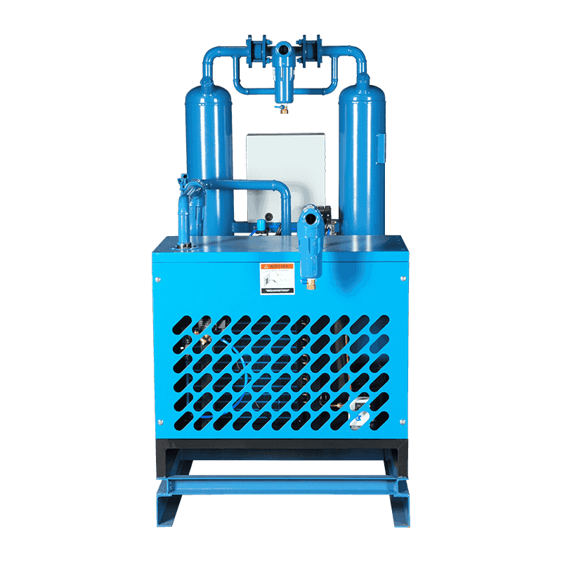 Sa mheaisín teaglaim gan teasa, téann an t -aer comhbhrúite isteach sa réamhthuairim ar dtús sa triomadóir fuar chun teas a mhalartú leis an aer comhbhrúite tirim ón triomadóir, ionas go méadaíonn teocht an aeir chomhbhrúite tirim, agus ag an am céanna, laghdaítear teocht an aeir chomhbhrúite chun an t -ualach a laghdú, agus cuid den uisce a laghdú chun an t -ualach oibre a laghdú. Ansin téann sé isteach sa ghalaithe le haghaidh malartú teasa ionas go ndéantar an t -aer comhbhrúite a fhuarú go teocht pointe drúchta de thart ar 5 ° C. Déantar an chuid is mó den uisce, den ola, agus de roinnt eisíontas san aer comhbhrúite a chomhdhlúthú anseo, agus tá an t-aer agus an t-uisce scartha ag an deighilteoir aer-uisce, agus ansin scaoiltear an t-uisce agus an ola tríd an draenálaí uathoibríoch. Téann an t -aer comhbhrúite triomaithe isteach sa triomadóir tríd an scagaire bainte ola, agus cuireann sé an t -uisce go dtí an teocht pointe drúchta a chomhlíonann na riachtanais. Baintear an t -aer comhbhrúite tirim a thagann amach as an triomadóir ansin leis an scagaire asbhainte deannaigh chun méid beag deannaigh a ghineann an triomadóir a bhaint, agus é a chur ar ais chuig an réamhthuairim sa triomadóir fuar chun an t -aer te agus tais a fhuarú, ionas gur féidir a theocht féin a mhéadú, rud atá tairbheach freisin do athghiniúint an triomaí. Ag an am céanna, is féidir leis an aer comhbhrúite tirim téite comhdhlúthú a chosc ó tharla sa phíblíne iompair.